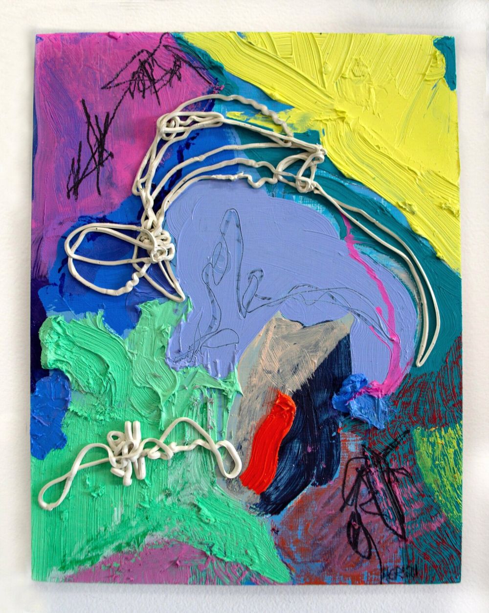 My works depict contorted, distorted, abstracted, and repeated portrayals of bodies, often my own. The bodies are rendered fragmented, fractured, ghost-like, and unfinished, or are reduced to lumpy flesh-like blobs of paint. Themes relating to survival, bodily catastrophe, cautious optimism, and the tension between control and surrender play out in my work through the use of layered compositions of bodily masses, highly saturated color palettes, and exaggerated scale. The act of incorporating joy and pleasure into these images through the use of vibrant color and playful texture is a necessary act in being able to imagine a future in which disabled people have everything they need to flourish. I practice defying internalized narratives about disability by incorporating forms that resist perceiving injury, deformity, or illness as unfavorable but rather celebrate and beautify the attributes that society generally regards as monstrous.